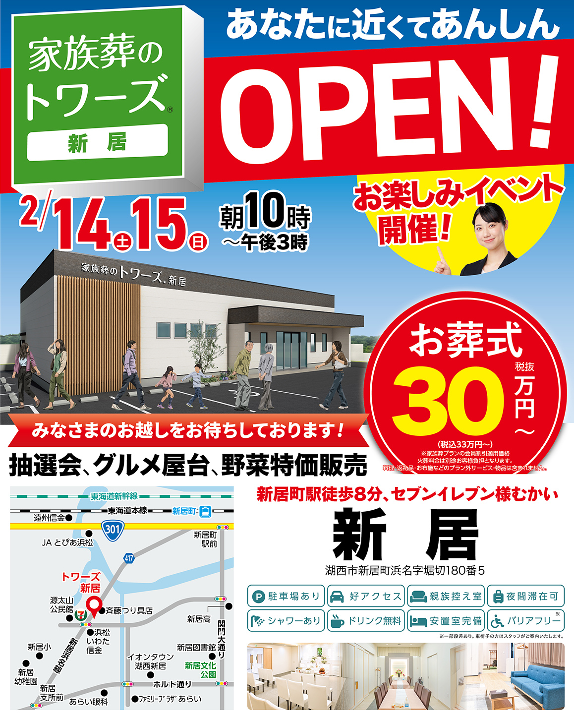 2月14日(土)、静岡県湖西市に2店舗目となる新居がオープンします。オープン当日から2日間にわたり抽選会・グルメ屋台・野菜特価販売などなど…お得な企画をたくさんご用意したお楽しみオープンイベントを開催いたします。予約不要でどなたでもご参加いただけますので、この機会にぜひ新居へご来館ください。