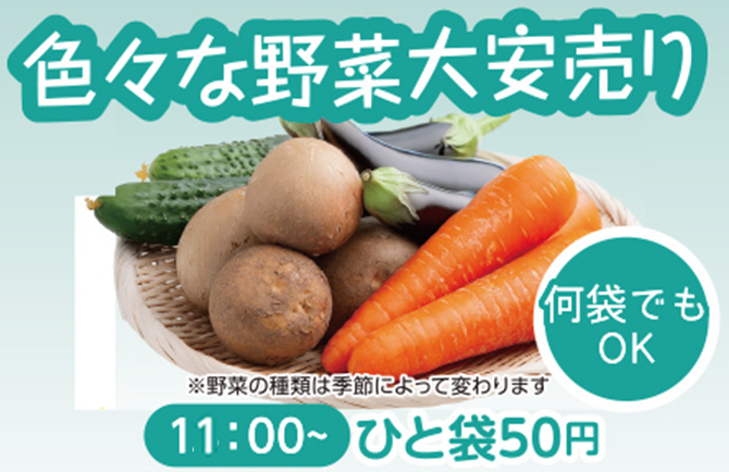 お財布にやさしい!野菜大安売りが今回はなんと!ひと袋50円!毎日の食卓にうれしい、安心・おいしい野菜をこの機会にぜひお買い求めください。物価高騰の昨今にうれしい企画です!お野菜の内容は当日のおたのしみ!※野菜の種類は季節によって変わります。