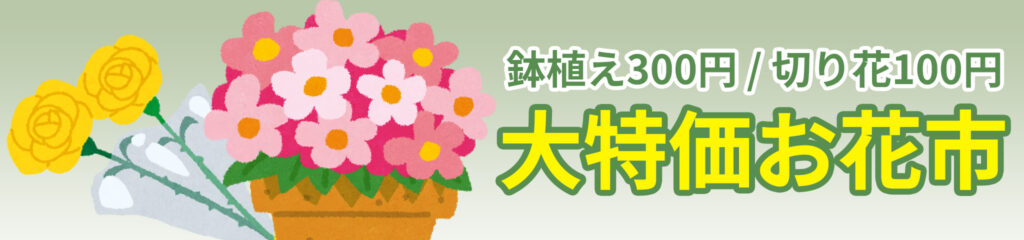 季節のお花をお得にご用意しました!当日は鉢植え1つ300円、切り花1本100円の特価で販売いたします。ご自宅の玄関やお仏壇を華やかに彩ってみませんか?数に限りがありますので、お早めにお越しください。
