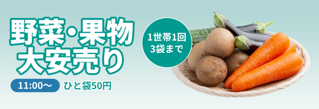 さらに当日は、新鮮な野菜・果物をひと袋50円で販売いたします。1世帯1回、3袋までとなっております。お得にお買い物を楽しみながら、季節の味覚をぜひお持ち帰りください。