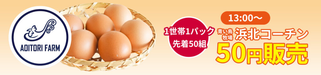 地元・青い鳥牧場のブランド鶏「浜北コーチン」の新鮮卵を、特別にご用意しました!なんと今回は、1パック50円!さらに、先着50組様・1世帯1パックまでの販売となります。地元で愛されるブランド卵の濃厚な味わいを、この機会にぜひお楽しみください。数に限りがありますので、お早めにお越しください!
