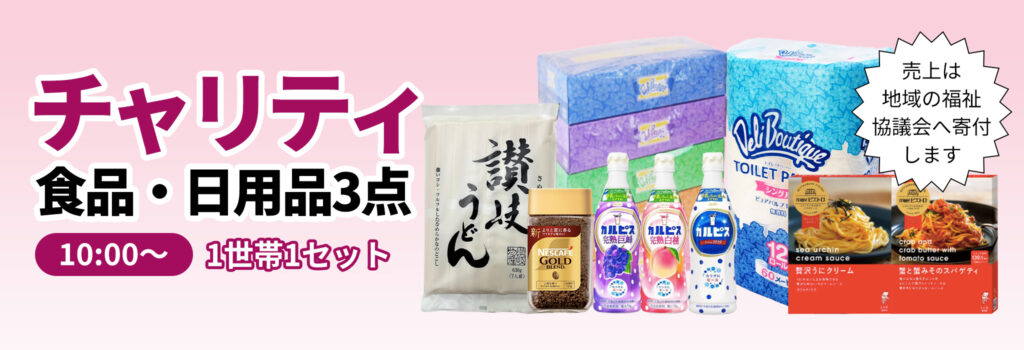 地域の福祉協議会へ寄付をしていただいた方に、食品・日用品3点をプレゼントいたします!1世帯1セットまで、物価高の昨今にうれしい企画ですので、この機会にぜひご参加ください。皆さまの温かいご協力をお待ちしております!