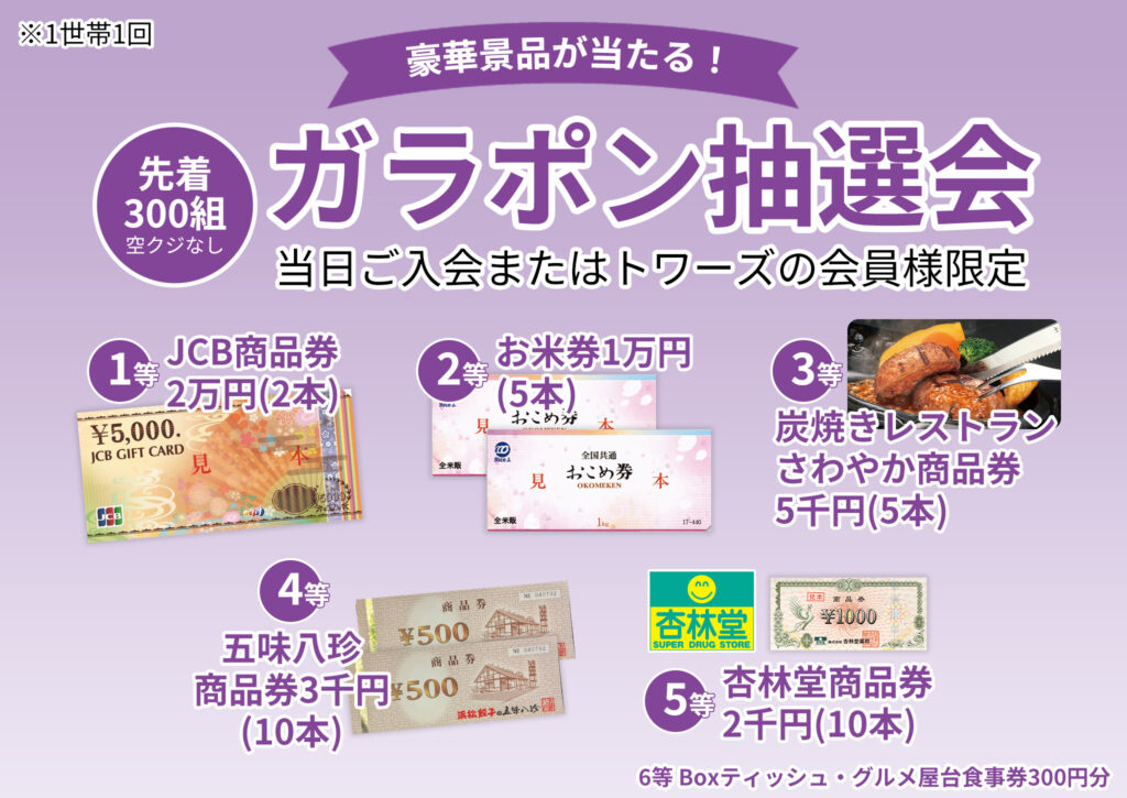 豪華賞品が当たる大抽選会を開催いたします。会員様、または当日ご入会いただい方限定、先着300組までとなっております。1世帯1回まで、ハズレなしのお得な抽選会ですので、ぜひご参加ください!