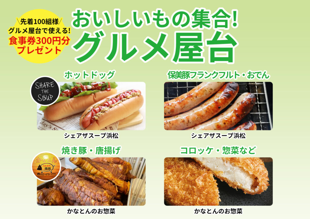 絶品グルメをお楽しみいただけるグルメ屋台を出店いたします。シェアザスープ浜松様より「ホットドッグ・保美豚フランクフルト・おでん」、かなとんのお惣菜様より「焼き豚・唐揚げ・コロッケ・惣菜など」をお召し上がりいただけます。ぜひこの機会に絶品グルメをお楽しみください!