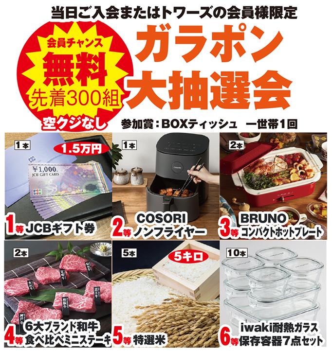 当日は会員様向けに豪華賞品が当たる大抽選会を開催いたします。当日【無料会員】に入会された方も対象となります!ハズレなしのお得な抽選会ですのでぜひご参加ください。