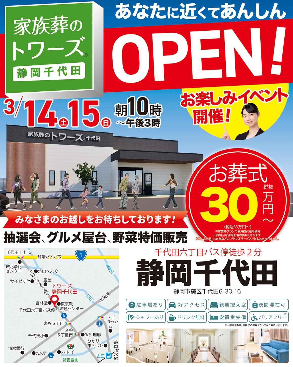 3月14日(土)、静岡県静岡市に10店舗目となる静岡千代田がオープンします。オープン当日から2日間にわたり抽選会・グルメ屋台・野菜特価販売などなど…お得な企画をたくさんご用意したお楽しみオープンイベントを開催いたします。予約不要でどなたでもご参加いただけますので、この機会にぜひご来館ください。