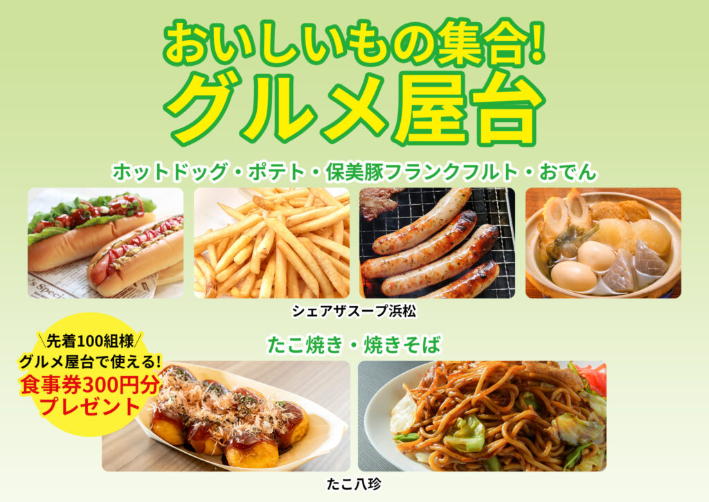 絶品グルメをお楽しみいただけるグルメ屋台を出店いたします。シェアザスープ浜松様より「ホットドッグ・ポテト・保美豚フランクフルト・おでん」、たこ八珍様より「たこ焼き・焼きそば」をお召し上がりいただけます。