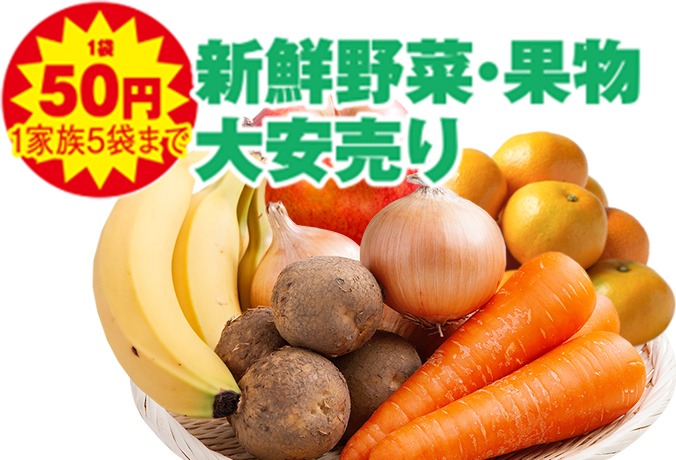 お財布にやさしい!新鮮野菜と果物のつめ合わせを50円・1家族5袋までご購入いただけます!毎日の食卓にうれしい、安心・おいしい野菜・果物をこの機会にぜひお買い求めください!お野菜の内容は当日のおたのしみ!
