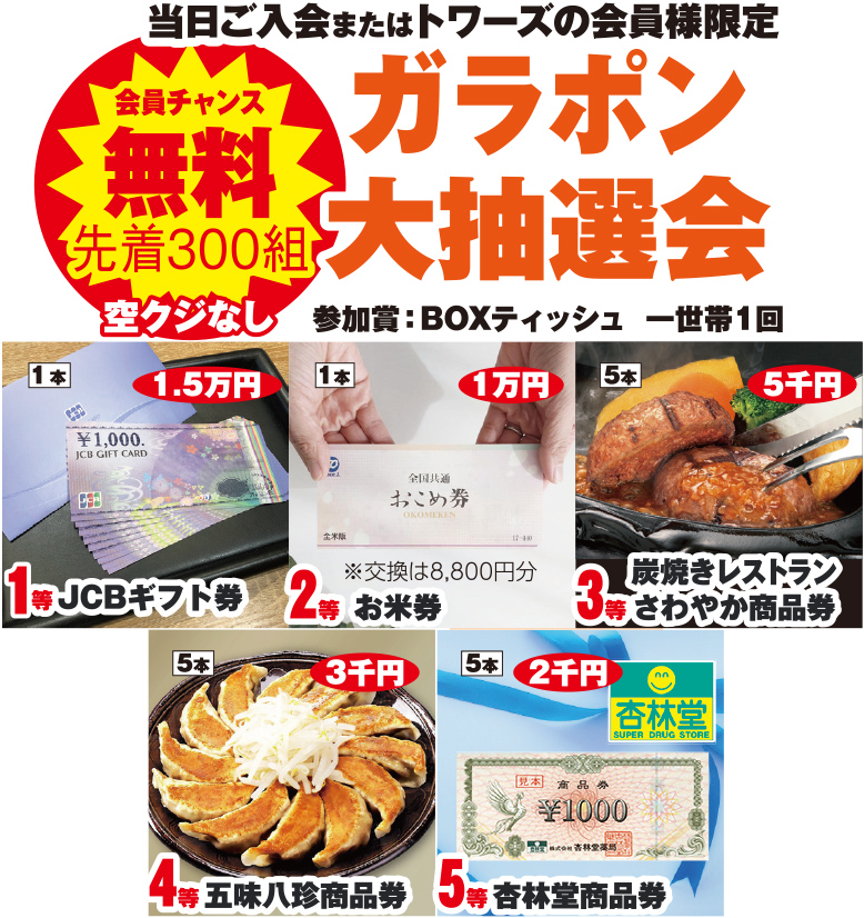トワーズ会員様、または当日会員へご入会された方へ!ギフト券や商品券など、暮らしに役立つ賞品が当たるガラポン大抽選会を開催いたします!当たってうれしい外れても楽しい、大人気の企画です。