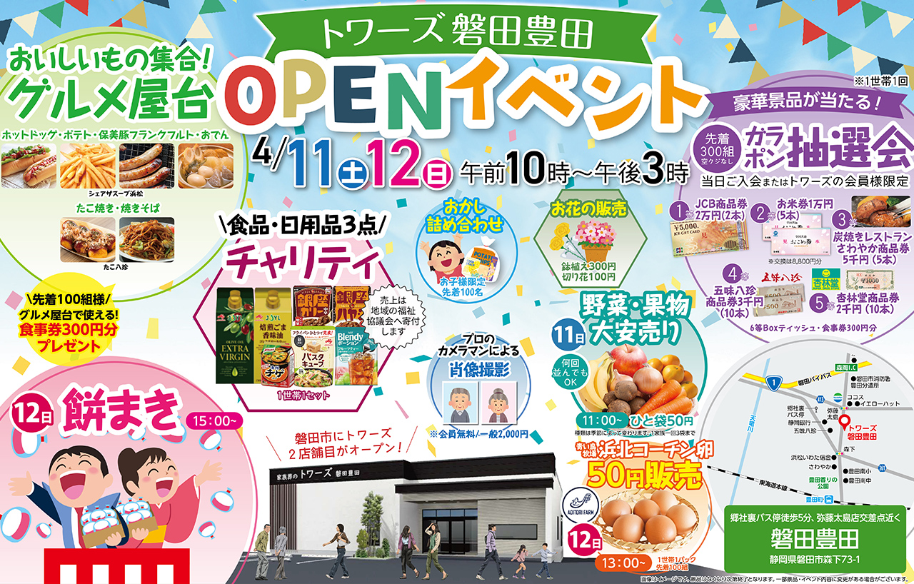誰でも参加できる!家族葬のトワーズ 磐田豊田オープンイベント 4月11日(土)、静岡県磐田市に2店舗目となる磐田豊田がオープンします。オープンに際しまして、ガラポン抽選会・グルメ屋台・餅まき・チャリティバザーなどなど…お […]